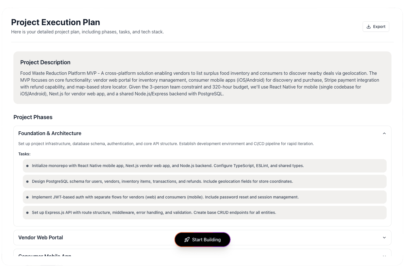 Through a structured chat, FlashBrain runs a discovery process, defines scope, selects the right technologies, and designs a complete project plan with phases, timelines, and deliverables automatically.