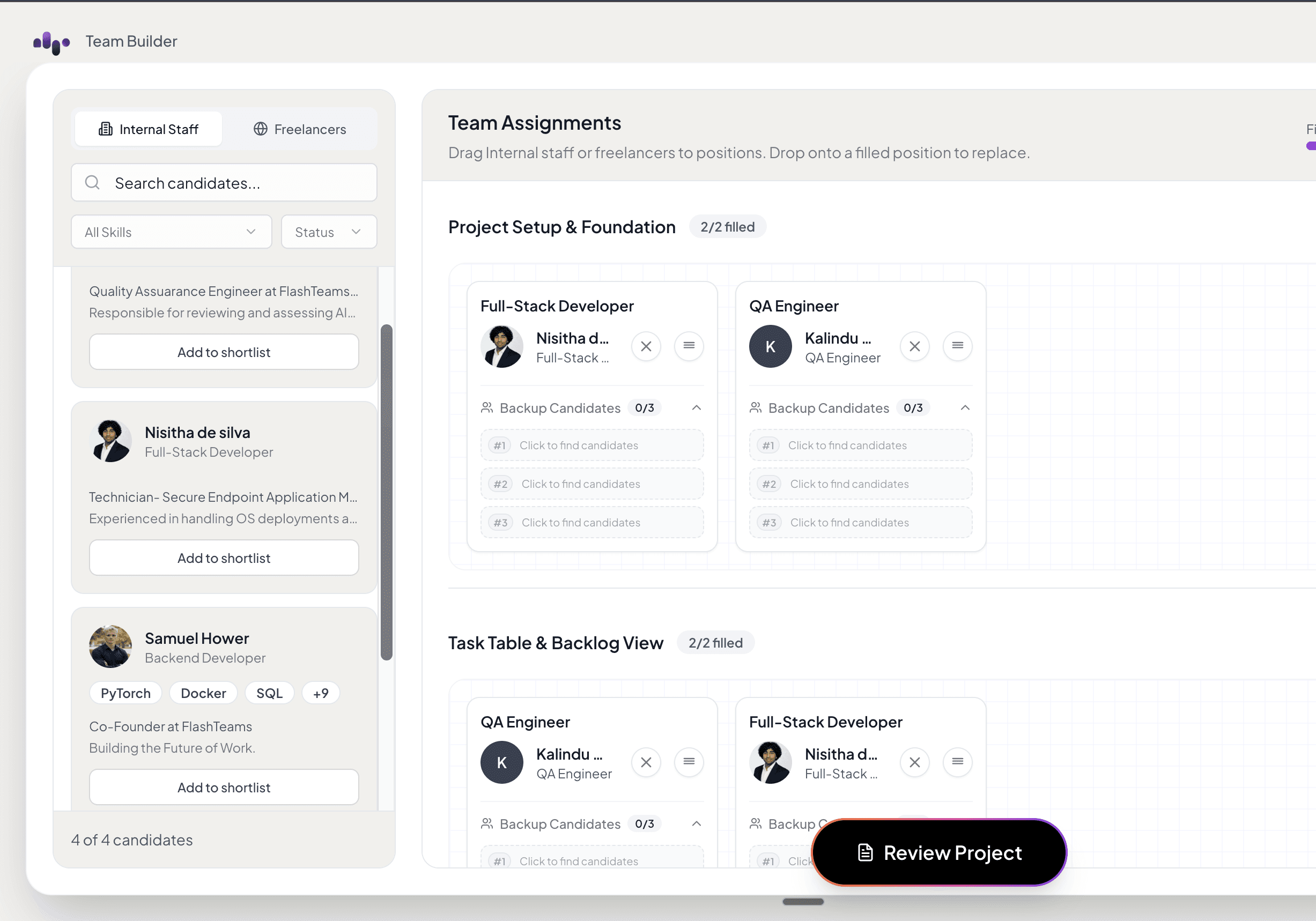 Identifies required roles and shortlists best-fit candidates based on skills, experience, and team dynamics.